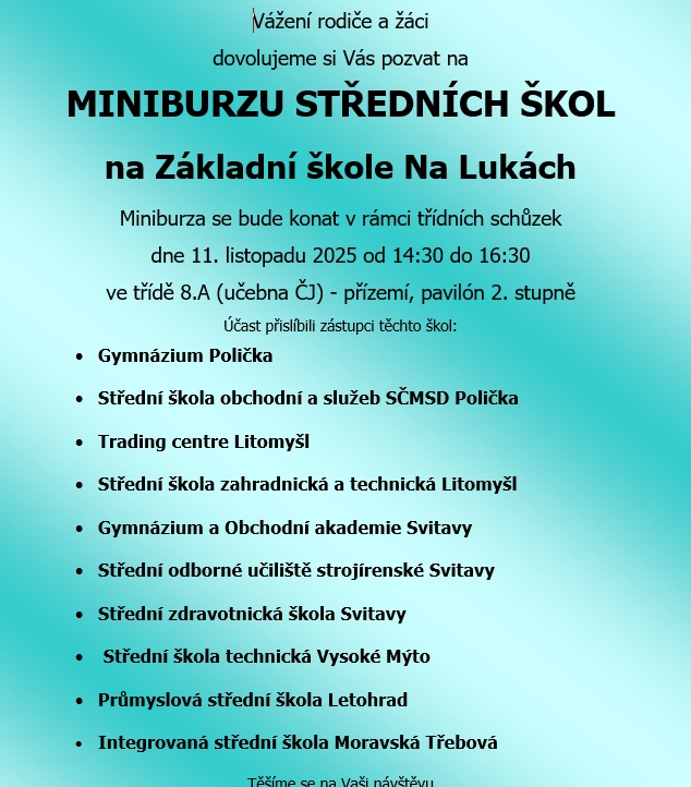 6. 11. 2025 se v 15:00 uskuteční v Mateřské škole Luční Polička informační schůzka rodičů budoucích prvňáčků.